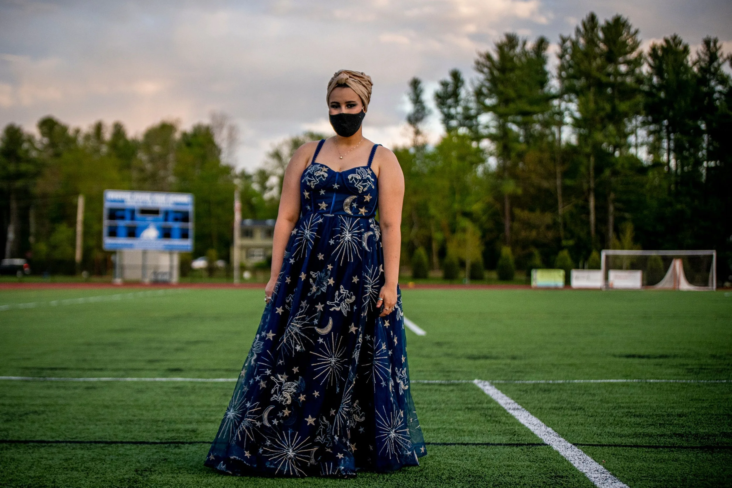 Oyster River High School student Anna Blezard, 18, poses during senior prom in Durham, New Hampshire on May 12, 2021. Oyster River High School juniors and seniors gathered outside, on the school's turf field, to celebrate what was  called a Mask-era